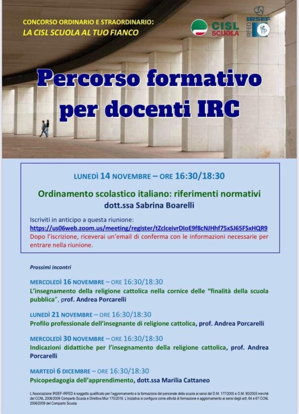 In previsione dei concorsi IRC (ordinario e straordinario), di prossima emanazione, la CISL Scuola, in collaborazione con IRSEF IRFED, realizza un percorso formativo GRATUITO , articolato in cinque seminari introduttivi, realizzati in modalità on line, a supporto della preparazione dei candidati.